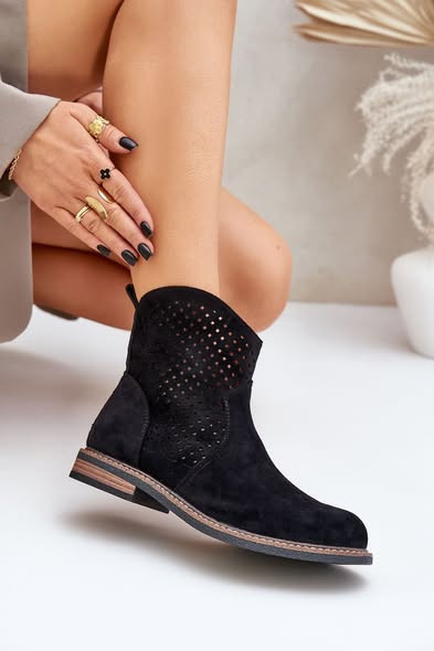 Botki ażurowe zapinane na zamek błyskawiczny od zewnętrznej strony. Wykonane z zamszu ekologicznego, skórzana wkładka wewnątrz została wykonana ze skóry naturalnej.
